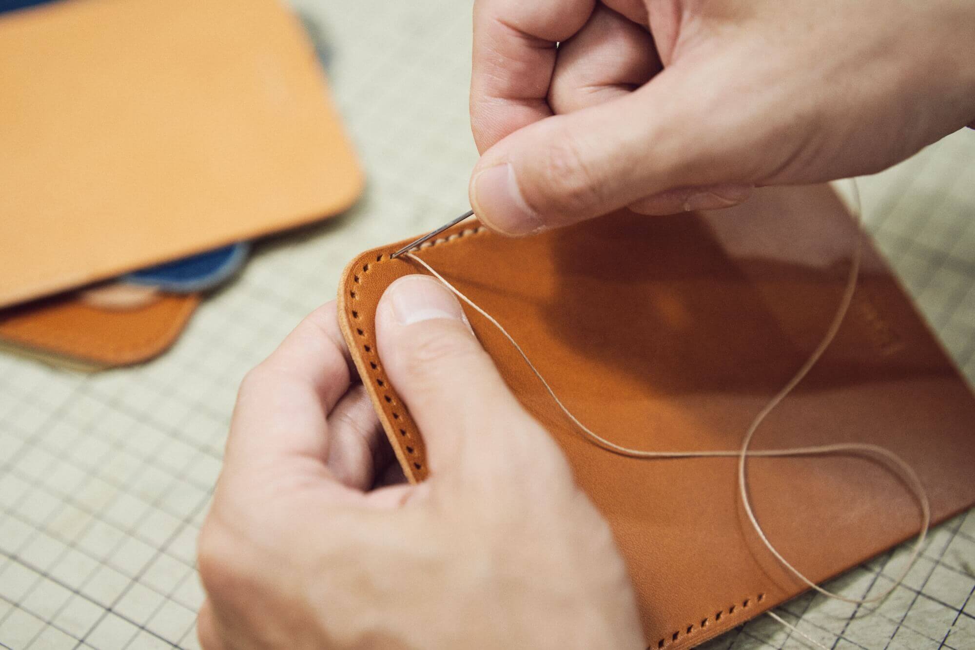 革は元々硬いため、そのままでは針を通すことができないので、手縫いで革製品を作る際には、まず目打ちで下穴を開け、その後、ミツロウを引いた丈夫な糸を使用して「サドルステッチ」という技法で、一針一針丁寧に縫い上げていきます。この縫い方は、両側から交互に針を通すことで、革にしっかりと糸が食い込み、非常に丈夫な仕上がりとなります。